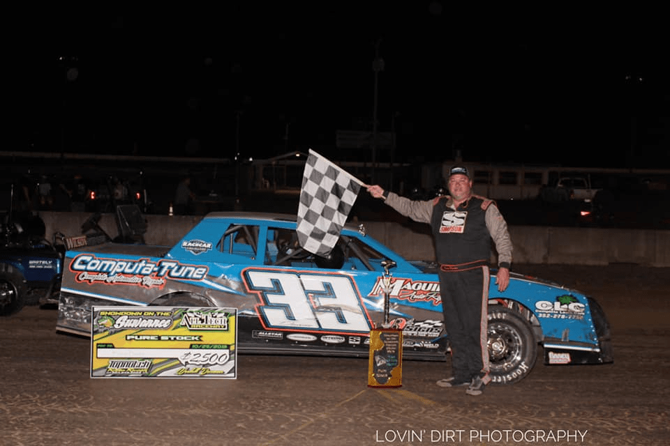 Second Feature up would be our Pure Stock Division. With a very Stout 24 car field of the top drivers in the South East. Green flag would wave, we would have Cory Howard (4) leading them back for the completion of lap one. We are three wide for second between Kevin Durden (33), Brandon Elwood (28) and Bubba Durbin (12b). With Durden (33) not wasting any time he takes the lead on lap number three. By lap number thirteen Durden (33) has stretched out his lead by about a straightaway. He would hit lap traffic around lap number twenty. A late race caution would come out and bunch them all up on more time. Jason Gamble (21) would take that to his advantage. As they would take the green he would battle hard for a few laps with Durden (33). But Durden (33) never let him get by him. As they come to the checkered we would have Kevin Durden (33), Jason Gamble (21), Mike Tovett (1shot), Bud Chancey (181) and Joey Haslauer (57p) rounding out your top five.