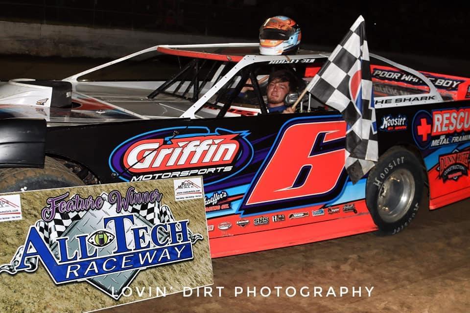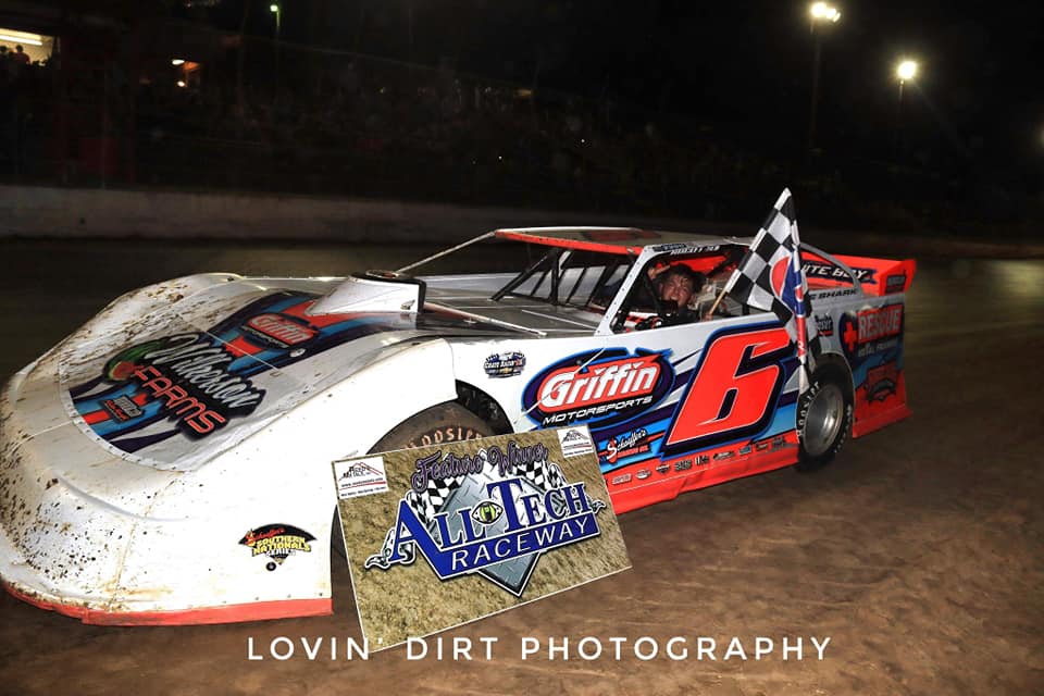 Next up would be our Southern Clash Late Models battling it out for a $3000 pay day! Very, very stout field of the best driver’s in the South on hand. Two Veteran driver’s on the front row, Mark Whitener (5) and Ivendent Lloyd, Jr (07). They would bring the field to green. Battles all over the track before we even complete a lap, but Mark Whitener (5) leads the field back to the Flagstand to complete lap number one. Now we see the “Shark” Clay Harris (6) lurking, looking to make a move on the Veteran’s, as he is looking to take second place from Lloyd (07). Great battle for fifth place now between Chad Tuten (51), John Baker (14B). As Tuten (51) would take it. We have caution bunching the field back up. Harris (6) would take an advantage of that restart as he takes the second place spot from Lloyd (07). As hard lunch would strike Lloyd (07) as he brings her into the pit area. Now with a very commanding lead over the field Whitener (5) would have hard luck strike him as well, as he breaks a driveshaft and J-bar ending up in the wall and ending his night. Now, the Lurking Shark, Harris (6), would be in the Hot Seat to take the green. Will it be a true “Shark Week” at All Tech Raceway as well?? After the restart they are battling hard everywhere for those final spots. Trey Person (21) is looking to take Kyle Vansickle (3K) for the fourth place position. And he makes a successful pass. As we have Clay “The Shark” Harris (6) leading them to the Checkered Flag, followed by Jason Fitzgerald (7), Chad Tuten (51), Trey Person (21) and Kyle Vansickle (3K) rounding out your top five.